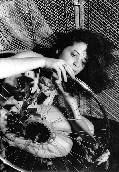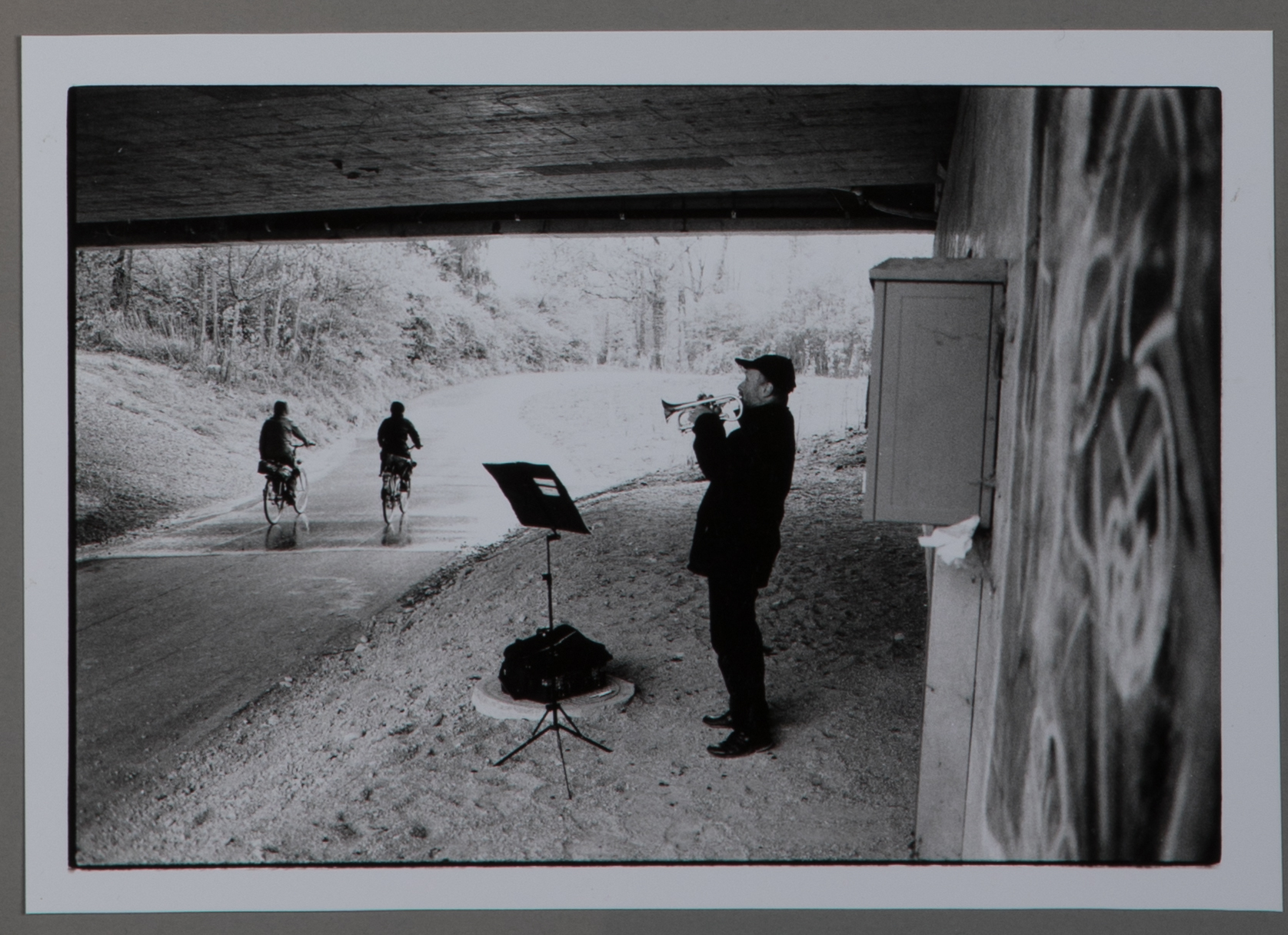 In der Bruchstrasse in Luzern zeigt er z.B. in Plakatgrösse den Landgang von neun Schwänen, die auf einem Wiesenflecken geschäftig herumpicken. Nur ein Schwanen-Päärchen, rechts im Bild, nimmt es offenbar gemütlicher und beobachtet die Szenerie, quasi wie der Fotograf. Und noch vor kurzem stellte Schläpfer auf derselben Plakatwand die Aufnahme eines Trompeters vor, welcher unter einer Autobahnunterführung vor vorbeifahrendem kleinem Publikum übte. So ist Humor ein Bildkonzept, das der Fotograf repetitiv einsetzt, wie auch z.B. das Zeigen geometrischer Anordnungen bzw. zufälligen Geometrien im Alltag. Neben dem fotografischen Einfangen seiner Umgebung ist der Fotograf gleichermassen ein Meister der Inszenierung. So steuert sich z.B. in seiner inzwischen wohlbekannten Aufnahme ein unbekleidetes junges Modell mit Hilfe eines Fahrradfelgens, wobei in den Speichen des Rades eine Rose eingeflochten ist, durch die Atmosphäre. In solchen fotografischen Konstruktionen verbindet Schläpfer Aktfotografie, Performance und Requisiten zu einem Gesamtbild, das nun eher nach den Gesetzen des Sinnlichen als nach jenen des Alltäglichen funktioniert! In diesen konstruierten Aufnahmen, in denen der nackte Frauenkörper, symbolhafte Figuren und Gegenstände, Lichter, Malereien des Künstlers und Schläpfer selber in Erscheinung treten, nähert sich der Künstler offenkundig der Malerei und auch seiner Malerei an. Und er findet gerade in diesen Aufnahmen, die aus den Zutaten „Emotionen und Fantasie“ bestehen, endgültig seine eigenständige fotografische Bildsprache.